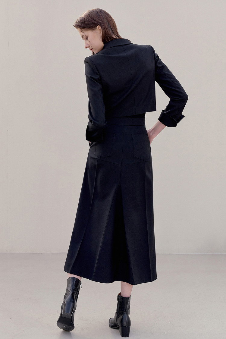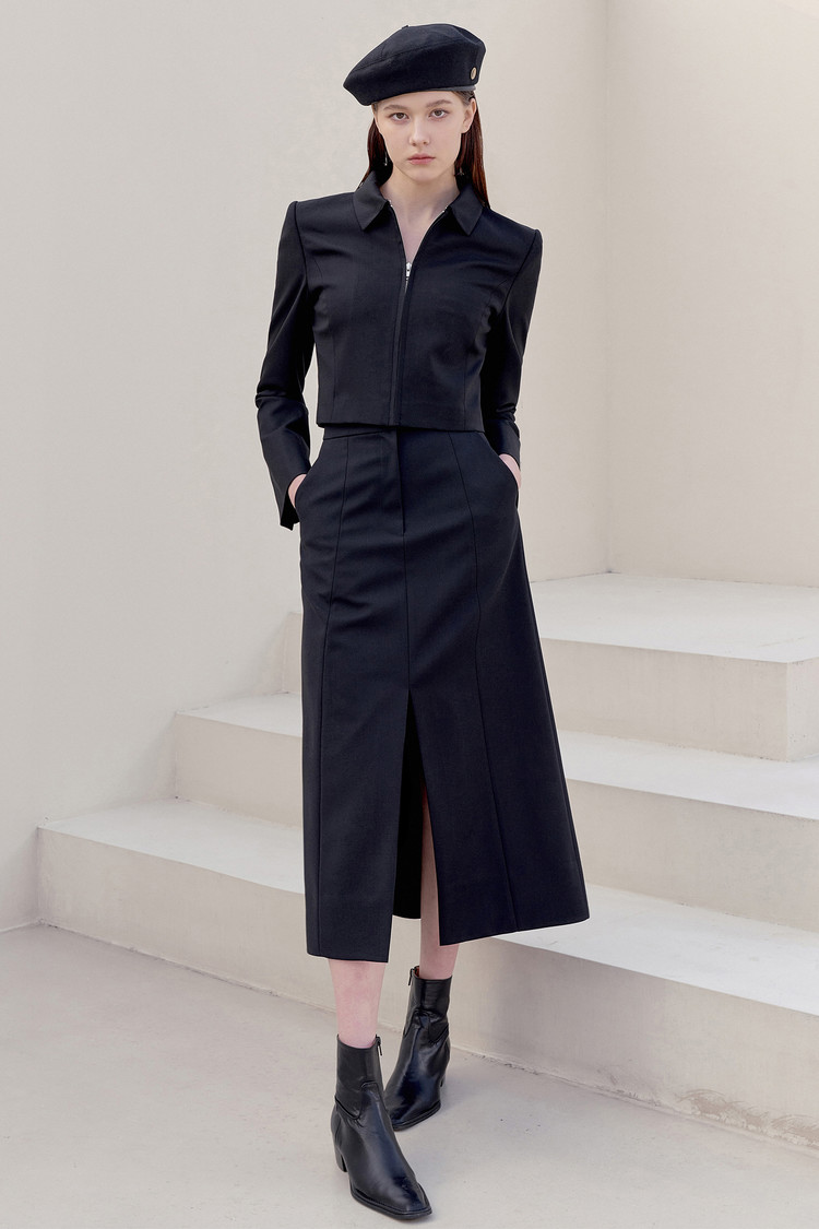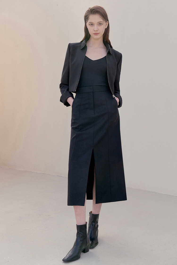 - 앞판의 긴 트임이 매력적인 롱스커트입니다. 샤이닝 고급 니켈 지퍼를 사용하여 일반 지퍼와는 차이점을 주었고 뒷판의 힙 다트와 삼각형 여유 분량으로 정직한 스커트의 여유를 살려주었습니다.