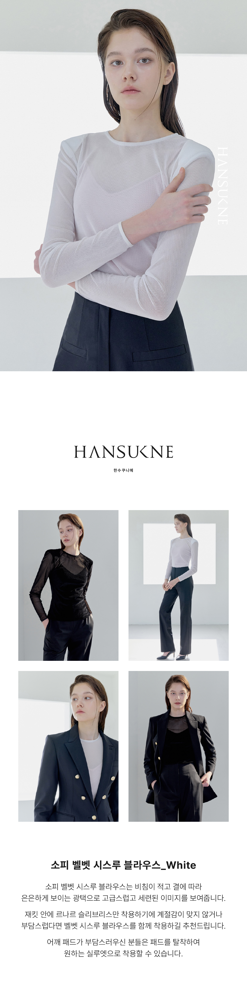 - 비침이 많은 시스루나 광택이 많은 벨벳 원단의 블라우스는 과해 보이거나 올드해 보일 수 있습니다. 소피 벨벳 시스루 블라우스 원단은 비침이 적고 결에 따라 은은하게 보이는 광택으로 고급스럽고 세련된 이미지를 보여줍니다.