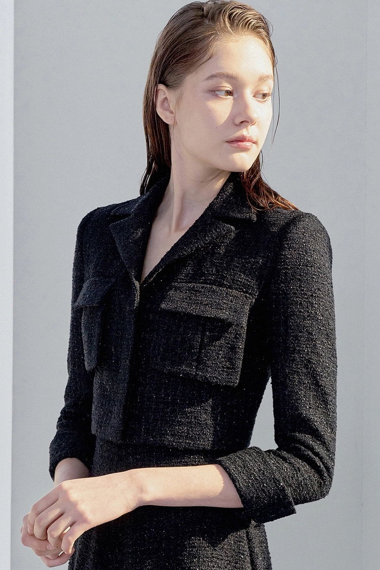 - 세렌 트위드 플레어 스커트와 함께 하객룩을 연출할 수 있는 재킷으로 양쪽 가슴 포켓이 캐주얼 한 포인트를 만들어줍니다.