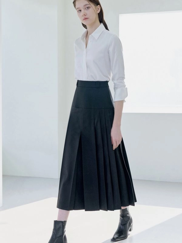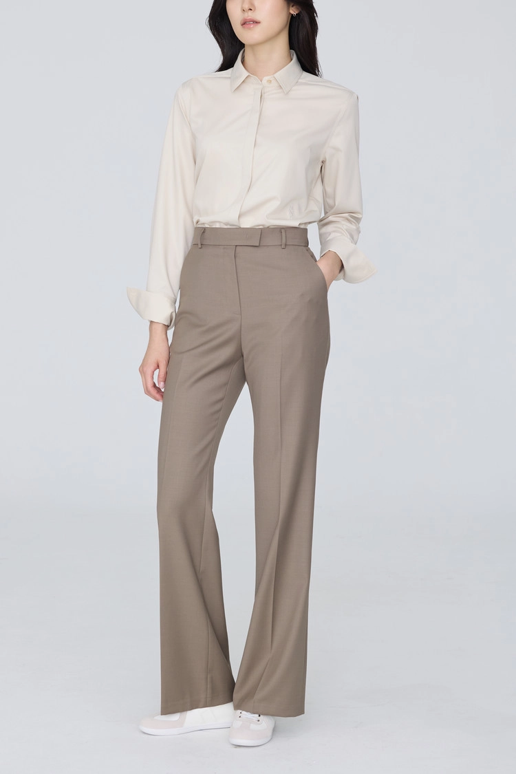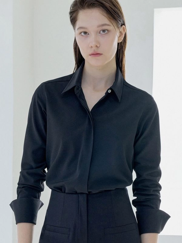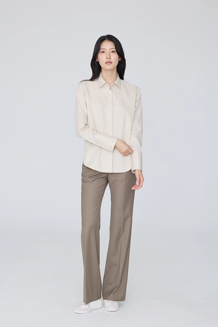 - 히든 여밈과 자개 단추로 완성된 스탠다드 핏 셔츠 블라우스는 미니멀하고 정제된 인상을 줍니다.
